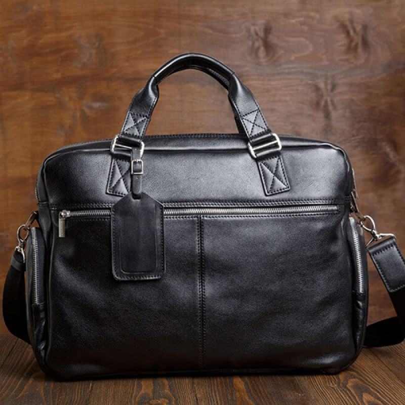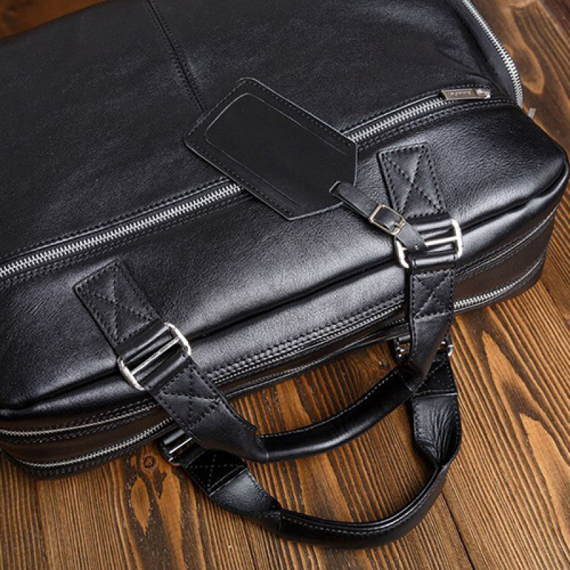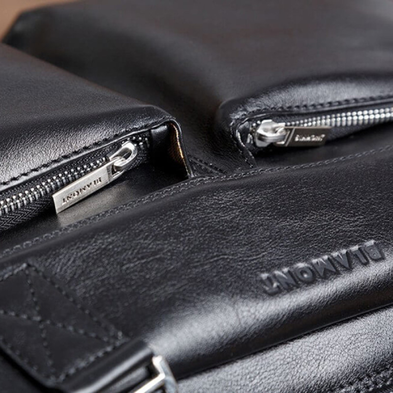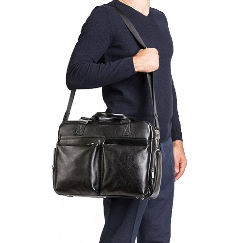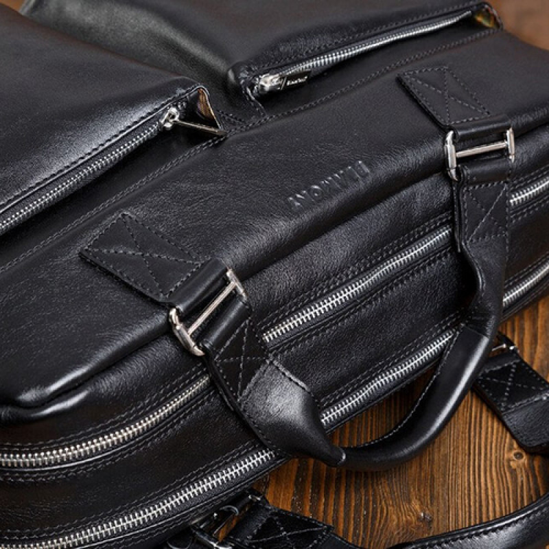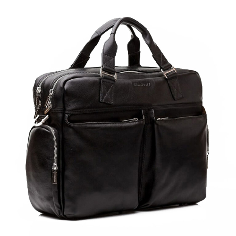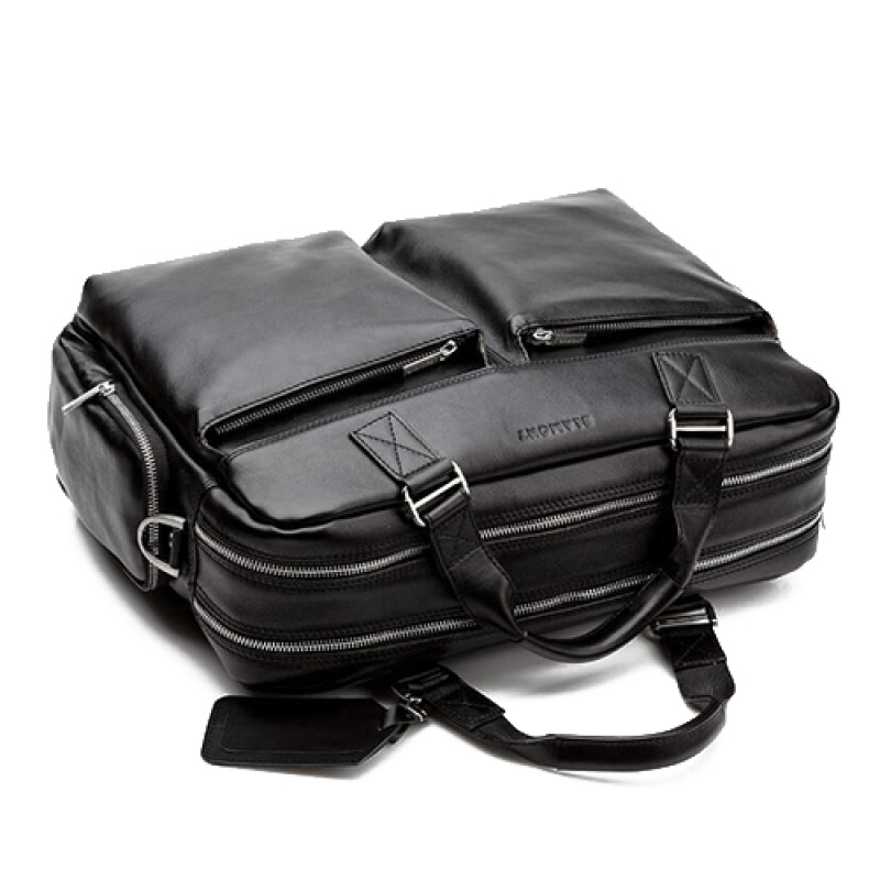 Мужская бизнес сумка из натуральной кожи черного цвета. В сумке два основных отдела на молнии, в одном из них органайзер и карман на молнии. Снаружи на лицевой стороне два вместительных кармана на молнии. С тыльной стороны карман на молнии во всю ширину сумки. Также имеются боковые карманы на молнии. В комплекте ремень через плечо регулируемый по длине.