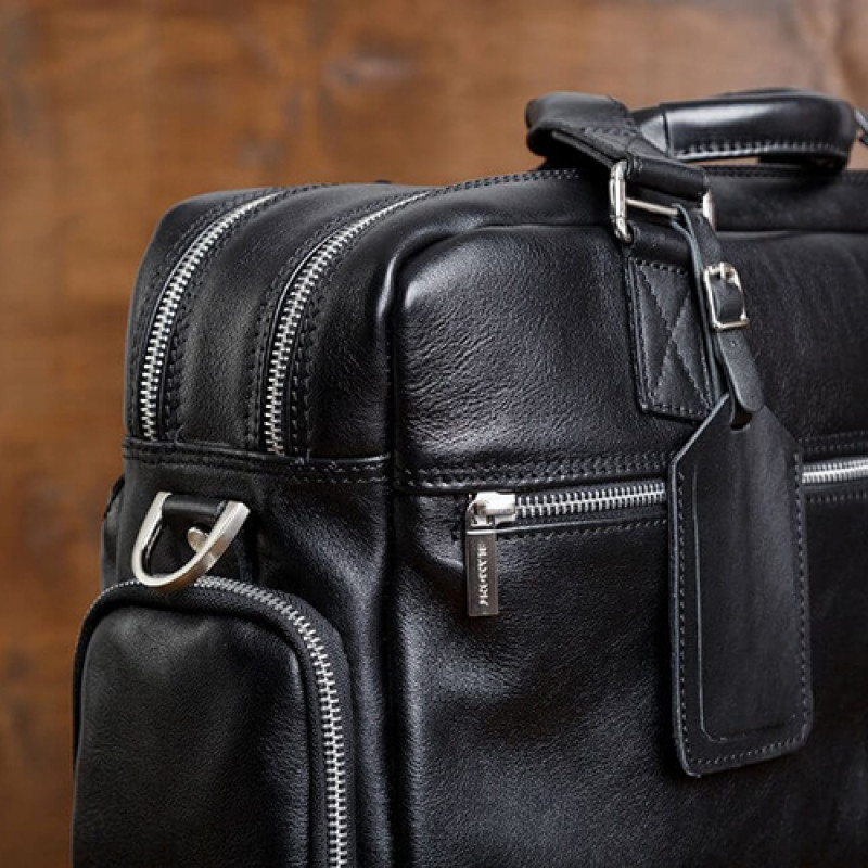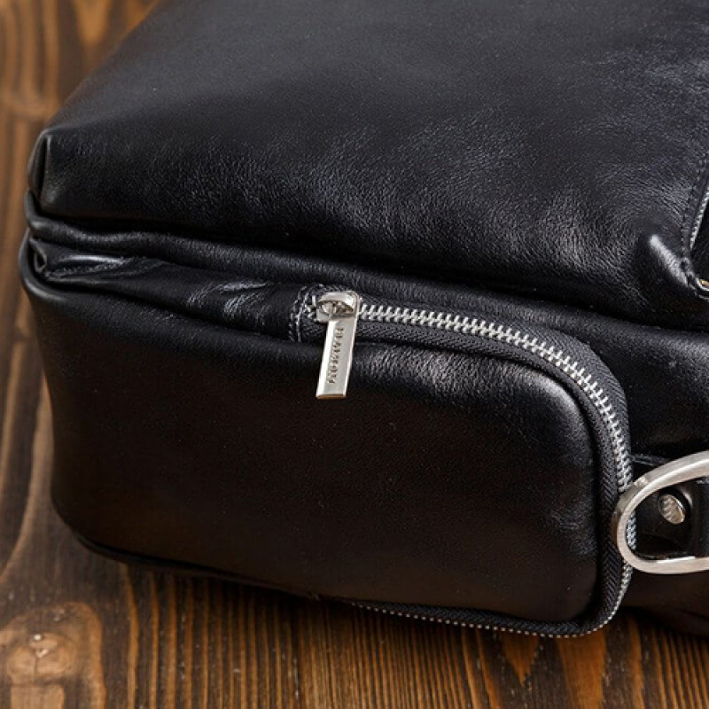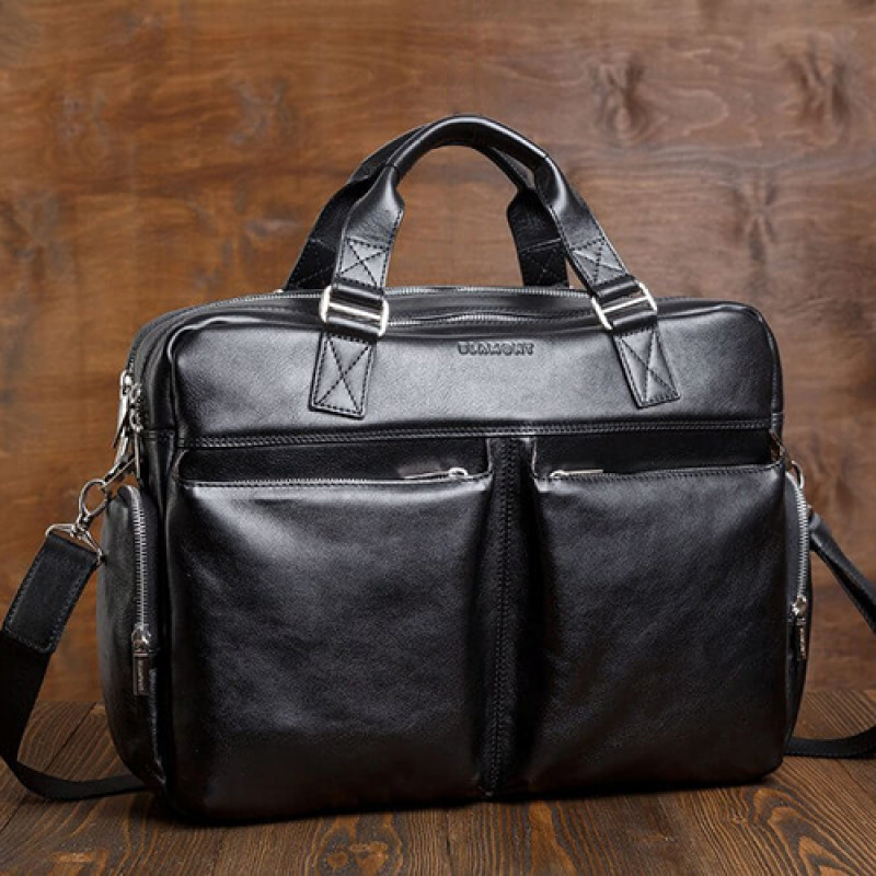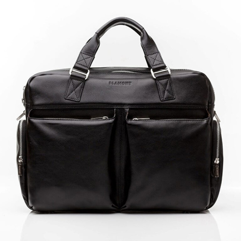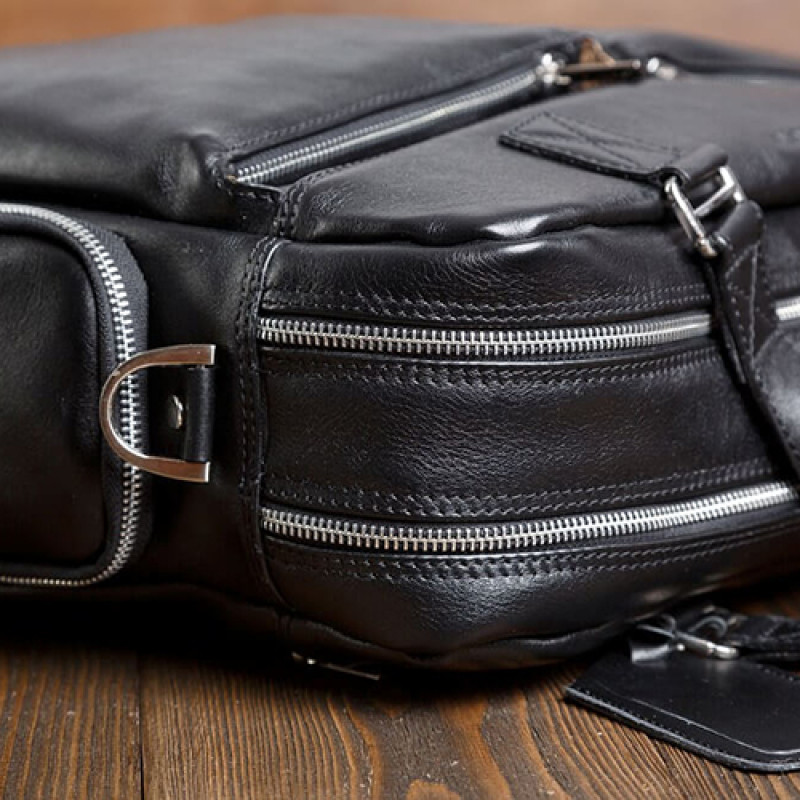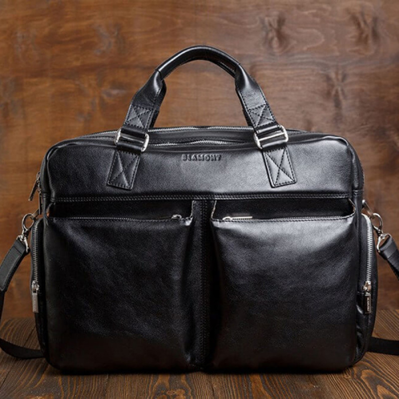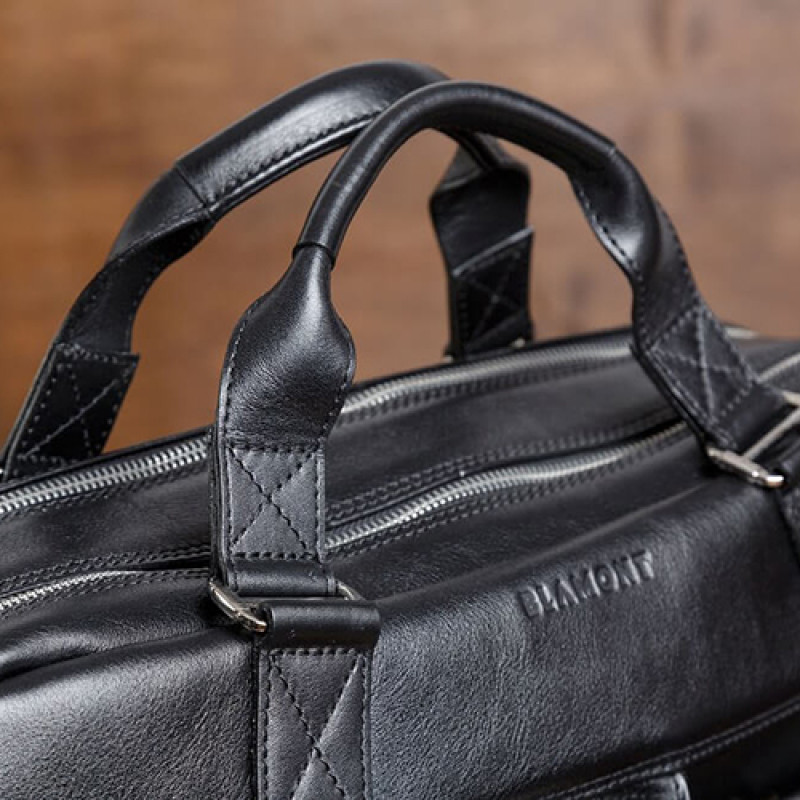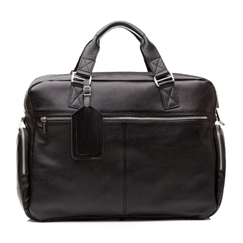 Мужская бизнес сумка из натуральной кожи черного цвета. В сумке два основных отдела на молнии, в одном из них органайзер и карман на молнии. Снаружи на лицевой стороне два вместительных кармана на молнии. С тыльной стороны карман на молнии во всю ширину сумки. Также имеются боковые карманы на молнии. В комплекте ремень через плечо регулируемый по длине.