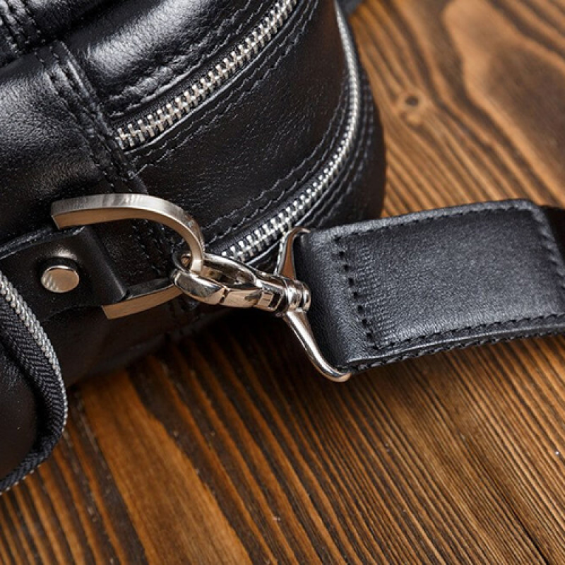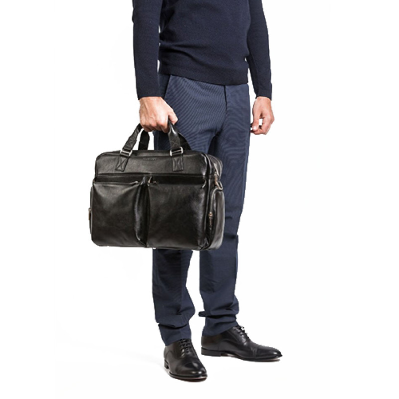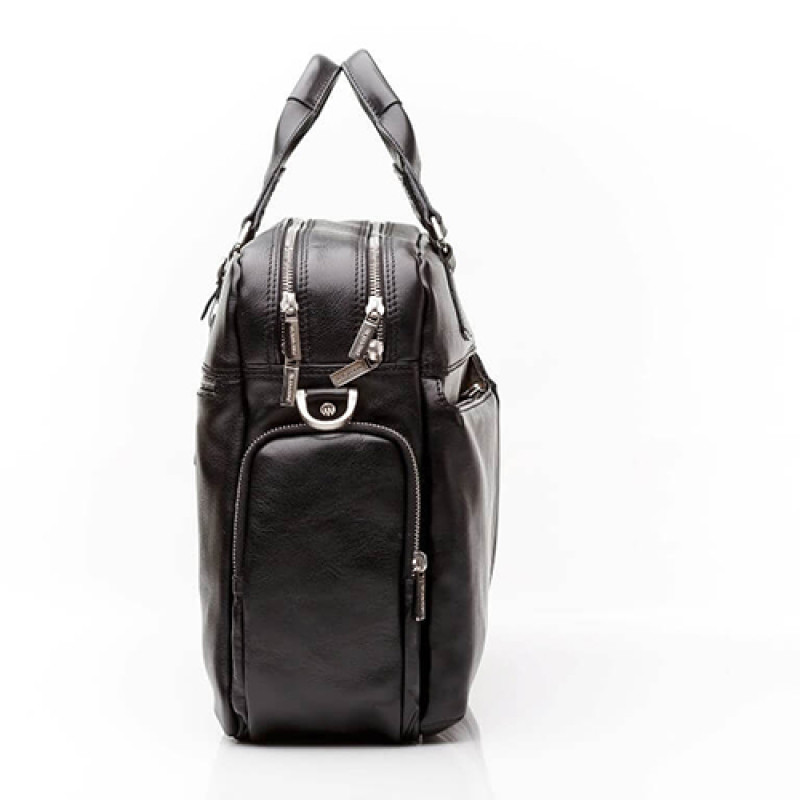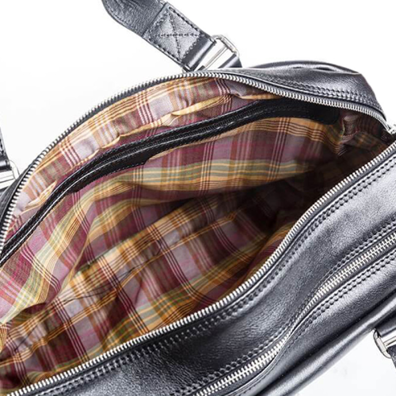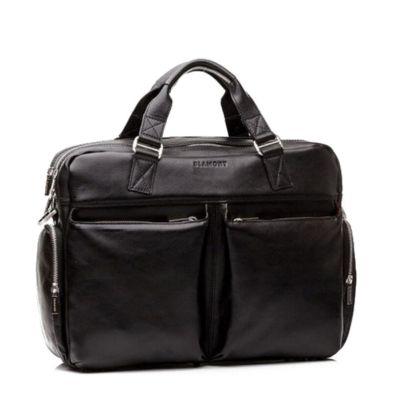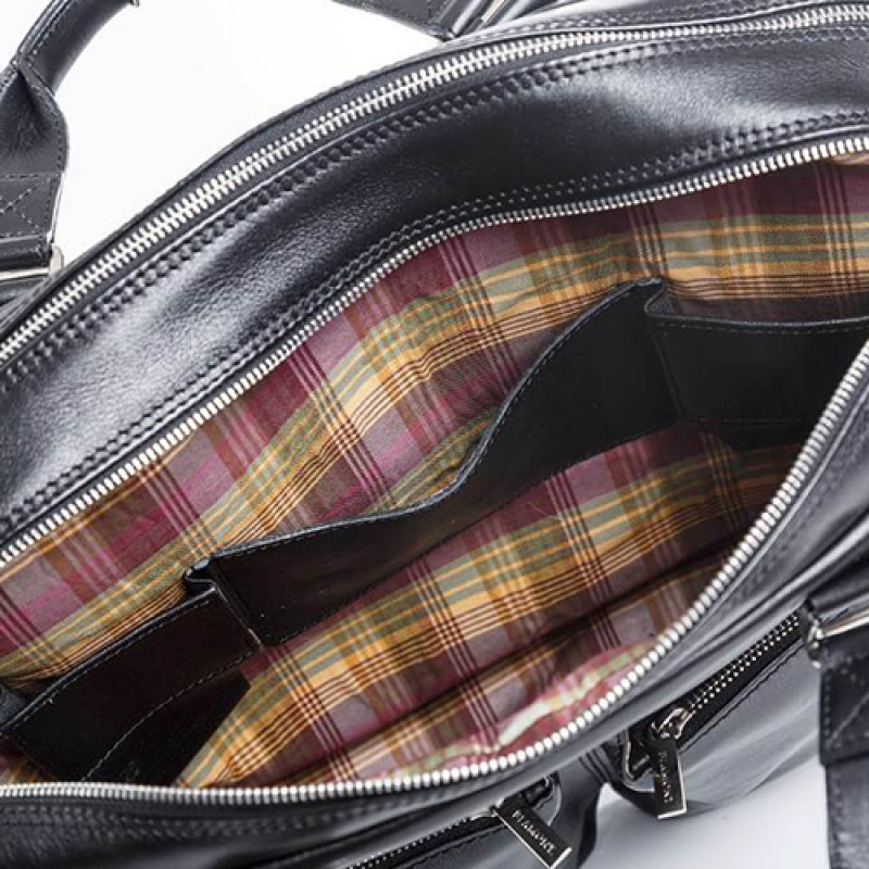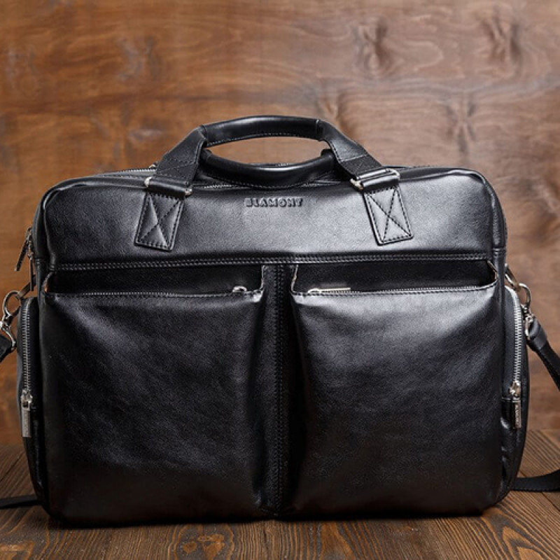 Мужская бизнес сумка из натуральной кожи черного цвета. В сумке два основных отдела на молнии, в одном из них органайзер и карман на молнии. Снаружи на лицевой стороне два вместительных кармана на молнии. С тыльной стороны карман на молнии во всю ширину сумки. Также имеются боковые карманы на молнии. В комплекте ремень через плечо регулируемый по длине.