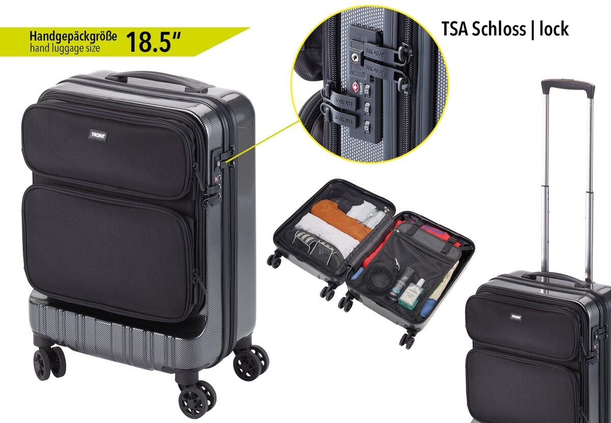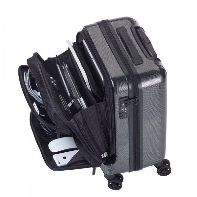 Твердый корпус защитит ваши вещи от ударов, падения или тряски. Множество продуманных карманов позволят удобно разместить вещи. Документы, билеты, мобильные устройства будут отлично себя чувствовать в верхнем боковом кармане. В большом нижнем отсеке найдется место, даже, для ноутбкука с диагональю до 13’’. В чемодане предусмотрена телескопическая ручка и удобные колесики. Закрывается чемодан на замок, что делает его содержимое недоступным для посторонних. Размер чемодана 18,5’’, что подходит под параметры ручной клади у большинства авиаперевозчиков.