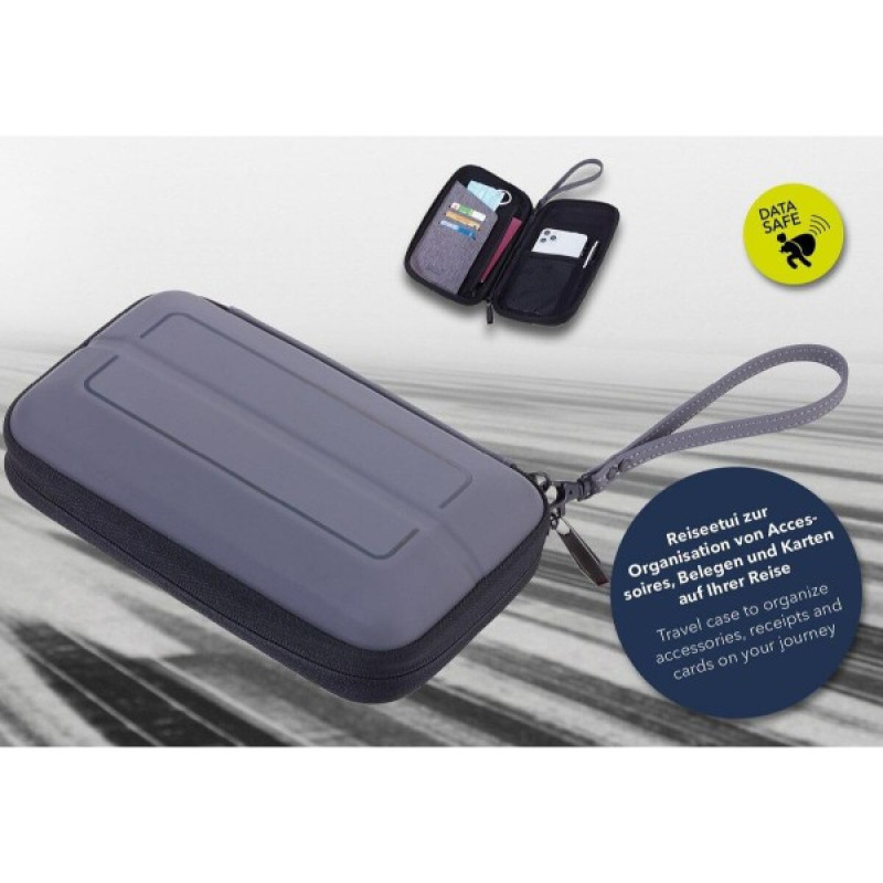 -Характеристики: • Дорожный футляр в твердом переплете для аксессуаров, чеков и карточек• 3 отделения для карт с защитой от шахрайства (для RFID-чипов) • Ремешок на руку (съемный) • Размер 23,4 х 14,5 х 5,8 см • Вес 175 г |