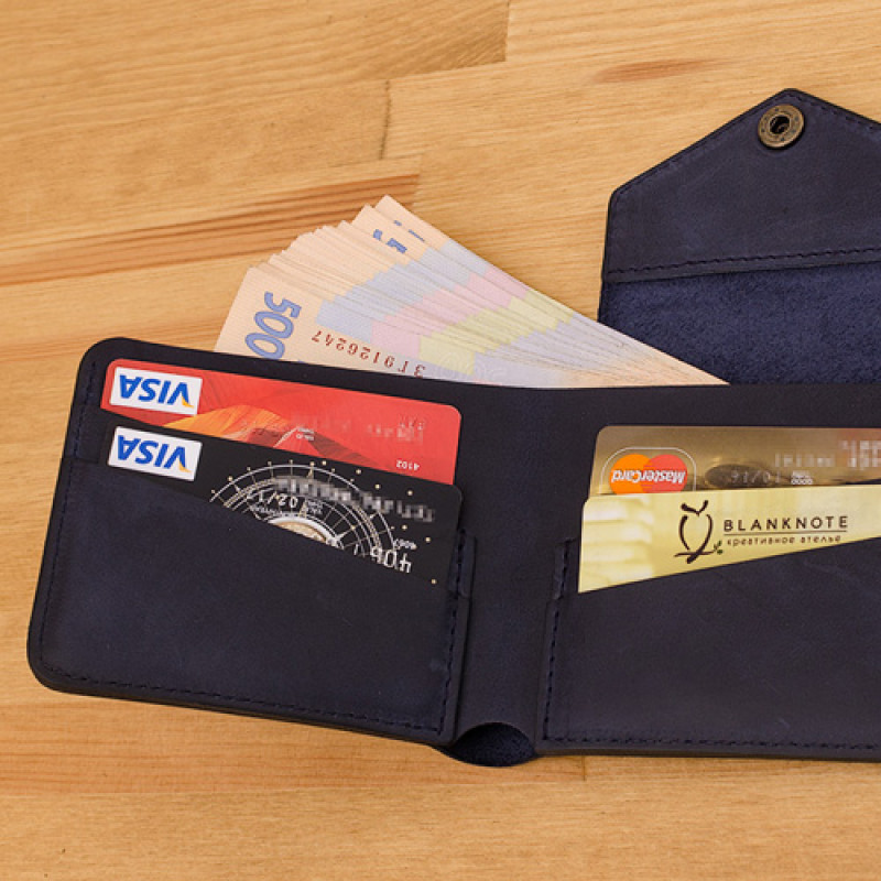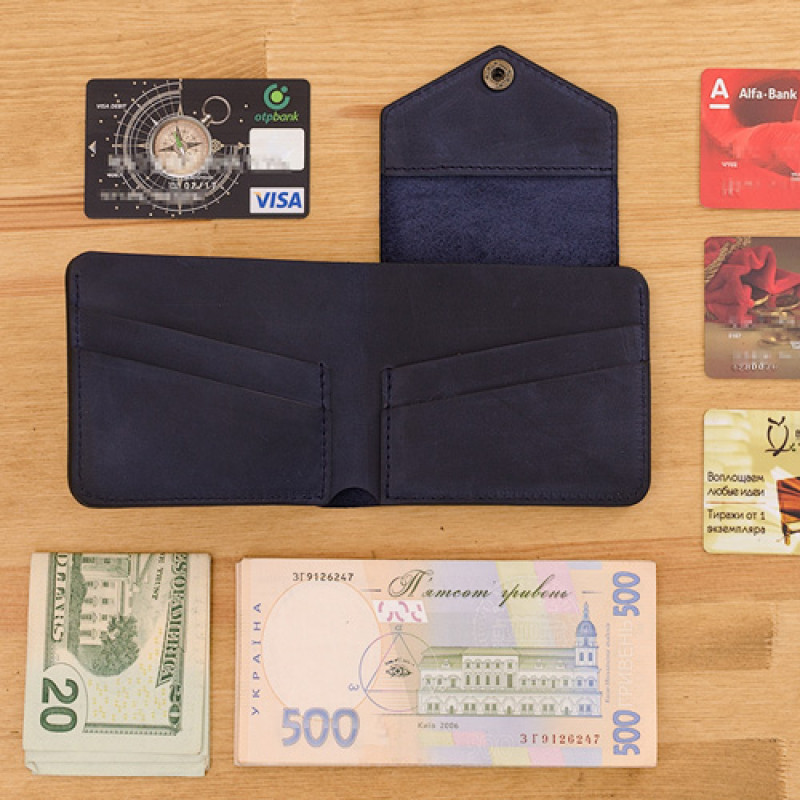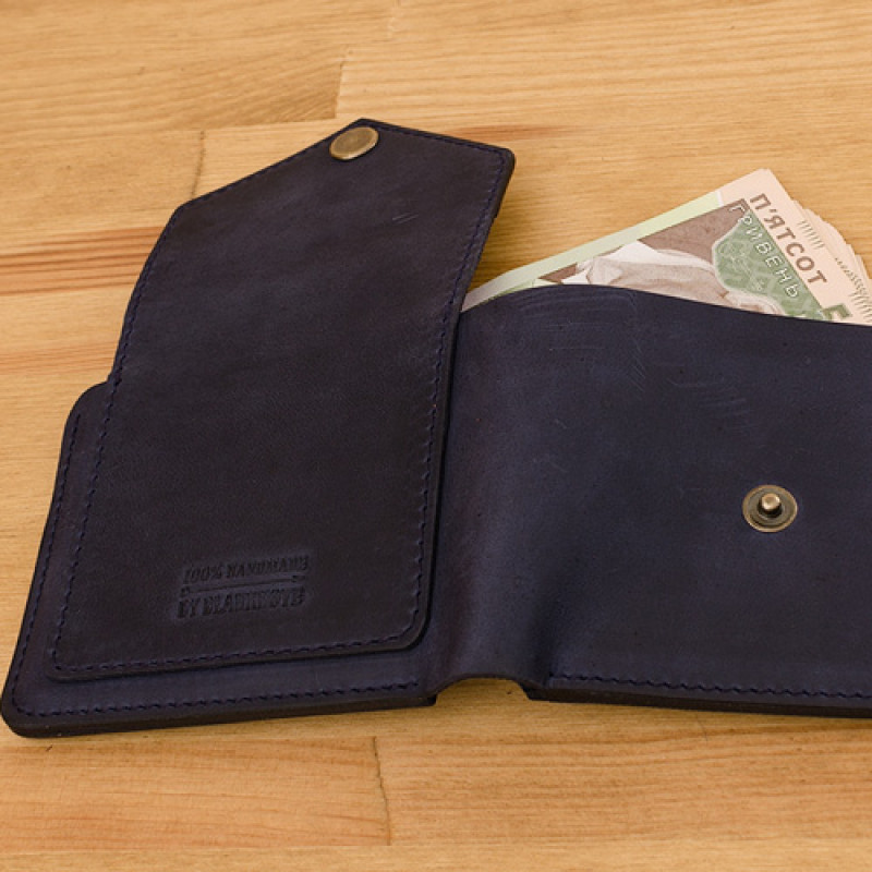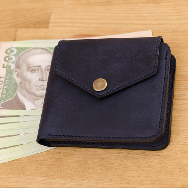 Классическая модель - стильное компактное портмоне с небольшим отделением для монет. Внутри есть одно отделение для купюр и 4 отделения для кредитных карт и визиток. Портмоне закрывается на клапан который формирует небольшую монетницу, закрывающуюся на кнопку с внешней стороны изделия. Подходит для любых купюр, в том числе - для евро и долларов. Сделано полностью вручную в нашей мастерской в Киеве. Натуральная кожа с винтажным эффектом.