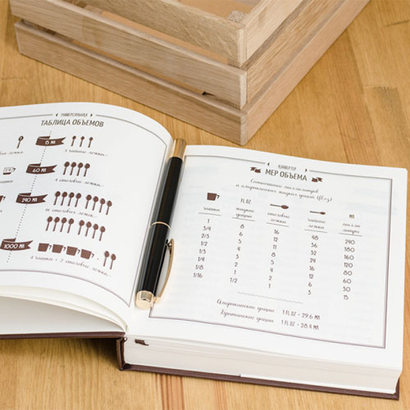 - множество полезной информации и табличек (меры объема и веса, способы приготовления различных каш, время варки яиц, примеры замены продуктов в рецептах и т.д.)