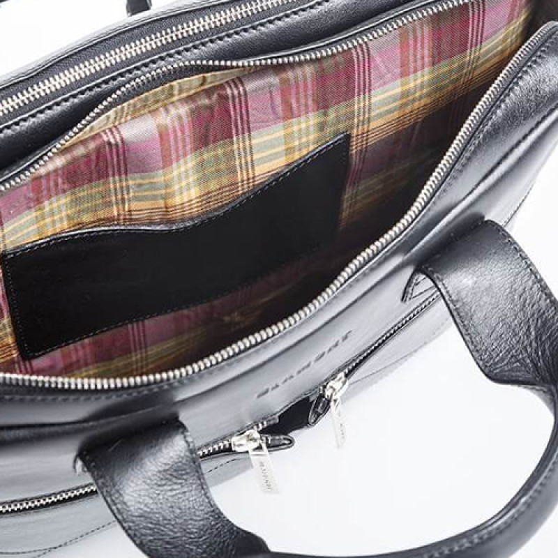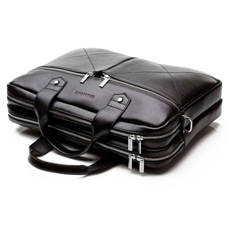 Мужская бизнес сумка из натуральной кожи черного цвета. В сумке два основных отдела на молнии, в одном из них органайзер и карман на молнии. Снаружи на лицевой стороне два вместительных кармана на молнии. С тыльной стороны карман на молнии во всю ширину сумки. Также имеются боковые карманы на молнии. В комплекте ремень через плечо регулируемый по длине.