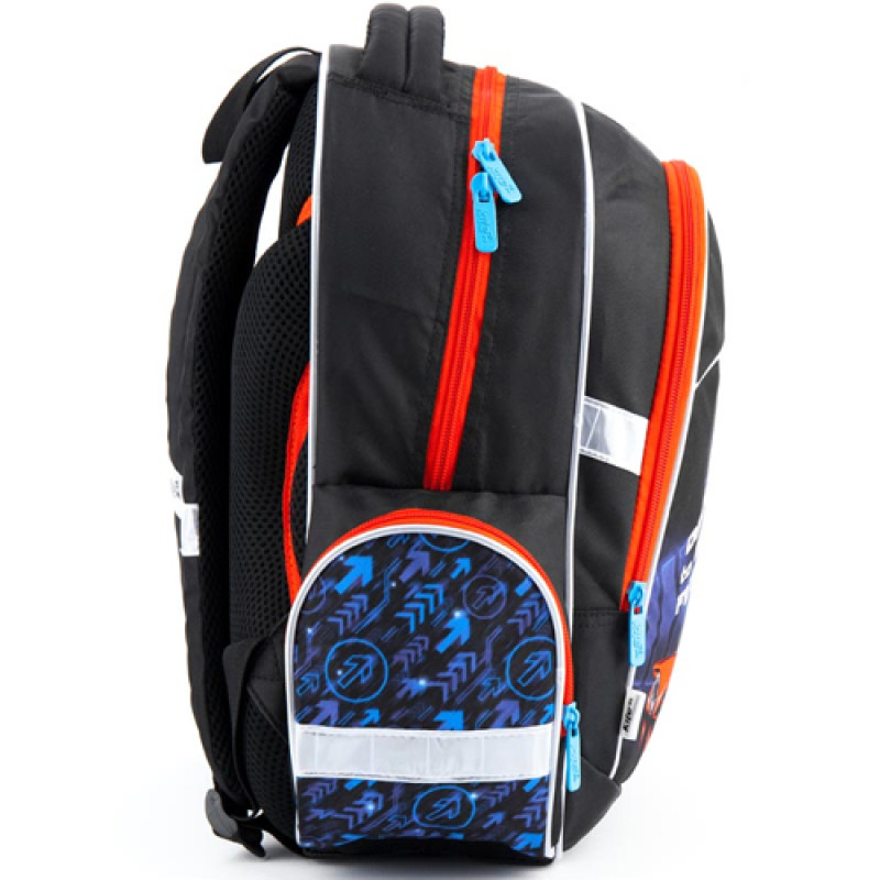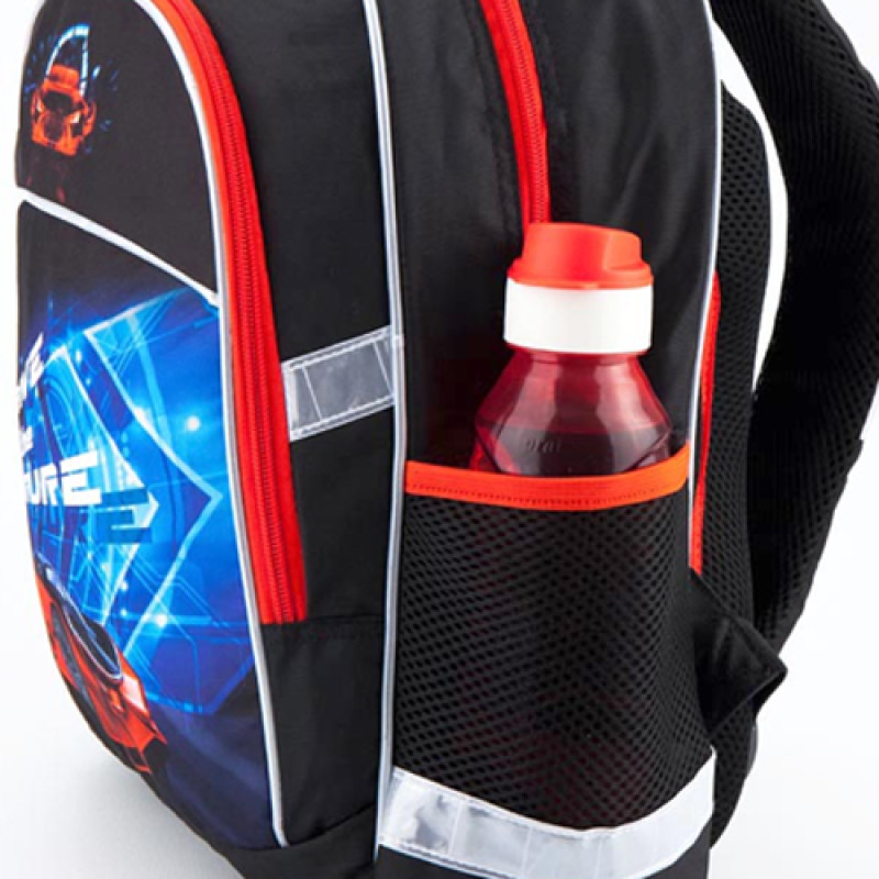 Внутренняя организация: | Есть два отделения, передний и 2 боковых кармана на липучке и на резинке, куда легко помещается бутылочка для воды, есть внутренние разделители для книг и тетрадей |