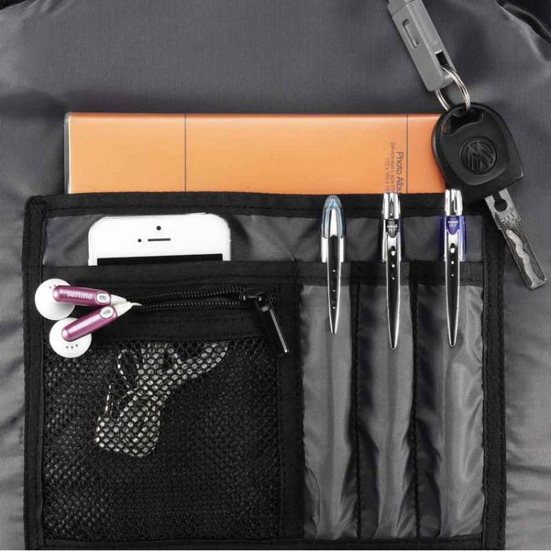 Внутренняя организация: | Большое отсек с мягким отделением для ноутбука, двумя сетчатыми карманами для мышки и блока питания, карман для аудио устройства. Средний отсек для документов А4. Передний отсек - органайзер с карабином для ключей |