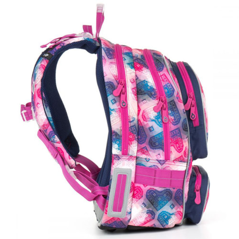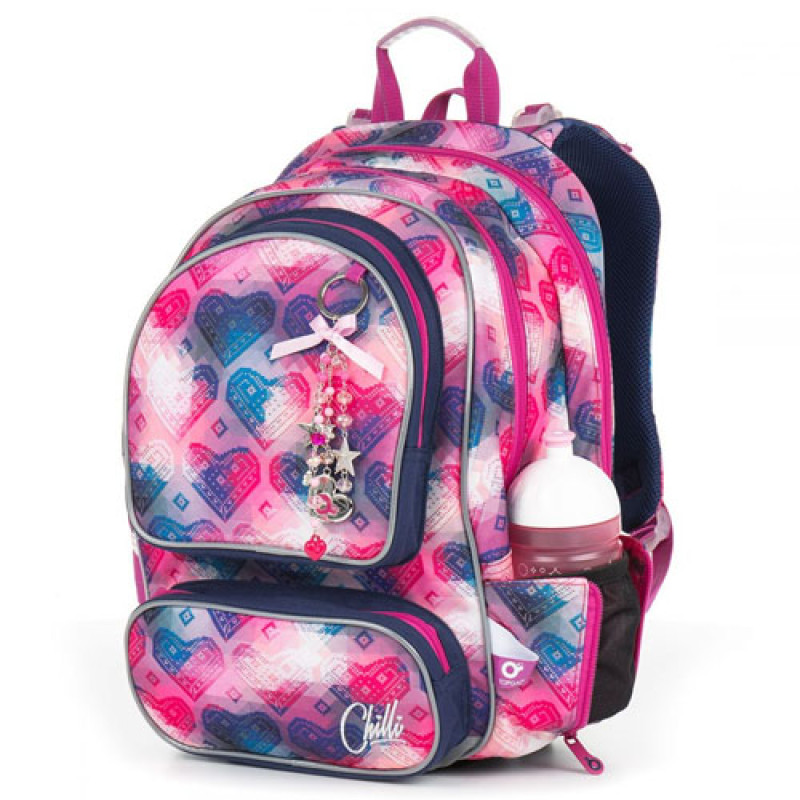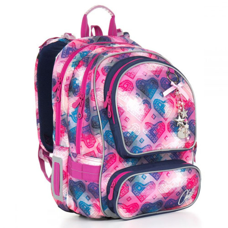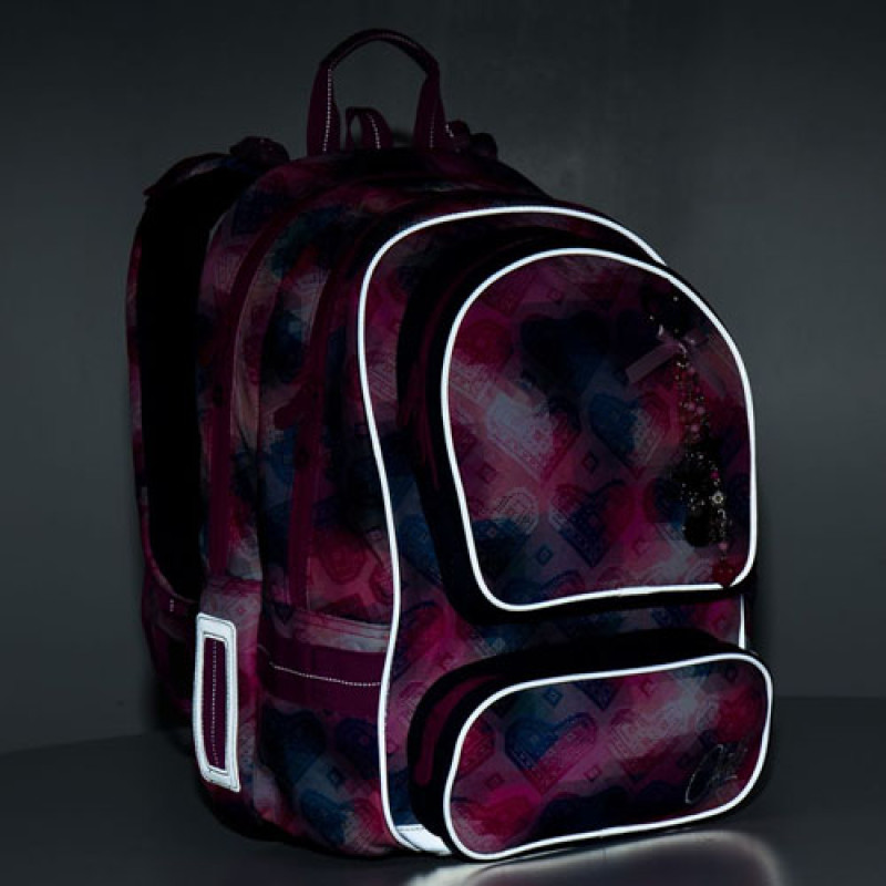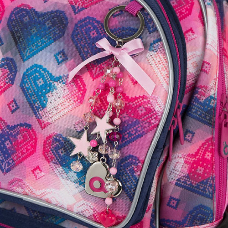 Описание товара: | Школьный рюкзак с мотивом сердец и оригинальным кулоном Имеет множество отделений и светоотражающих элементов. |