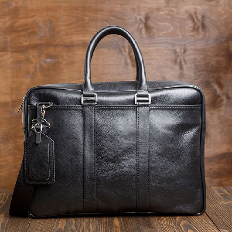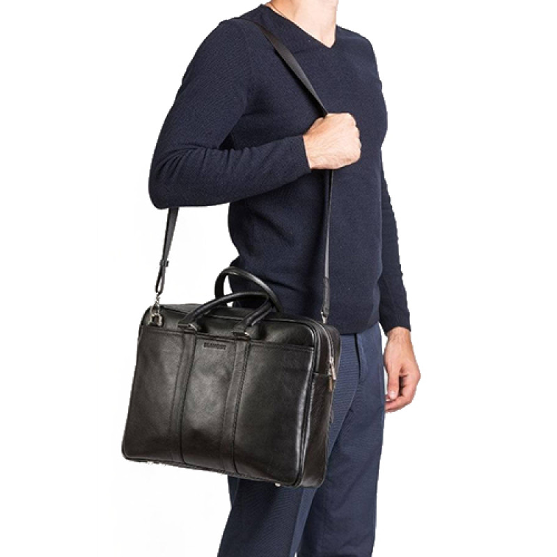 Кожаная деловая сумка мужская Blamont. Сумка из натуральной телячьей кожи черного цвета. Отличная сумка для работы, деловых встреч, повседневного использования. Размеры сумки позволяют разместить в ней ноутбук до 16 дюймов. В сумке одно основное отделение на молнии и накладные карманы для мелочей. Снаружи карманы на молнии впереди и сзади. На дне металлические ножки. В комплекте ремешок регулируемый по длине.