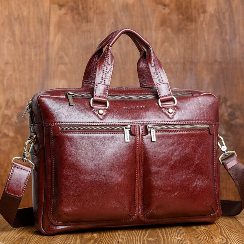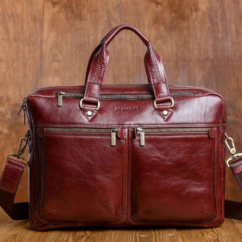 Стильная мужская сумка из качественной кожи красно коричневого цвета. В сумке одно отделение с отделом для ноутбука и органайзером. Снаружи два кармана впереди и карман сзади. Ремешок регулируемый по длине в комплекте.
