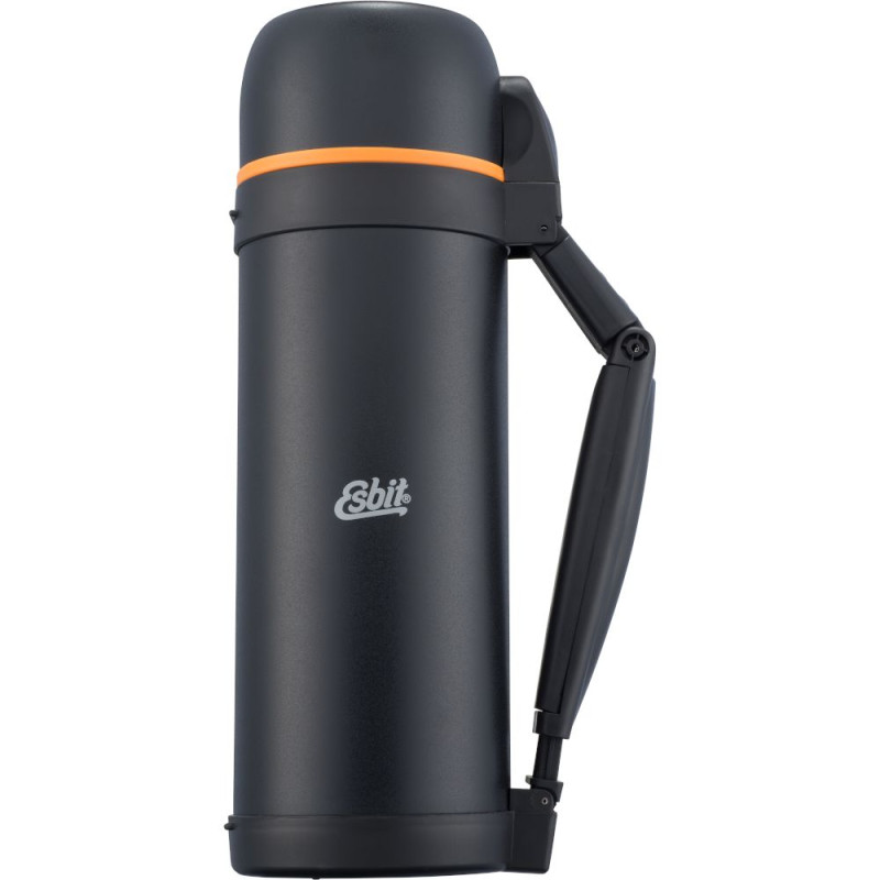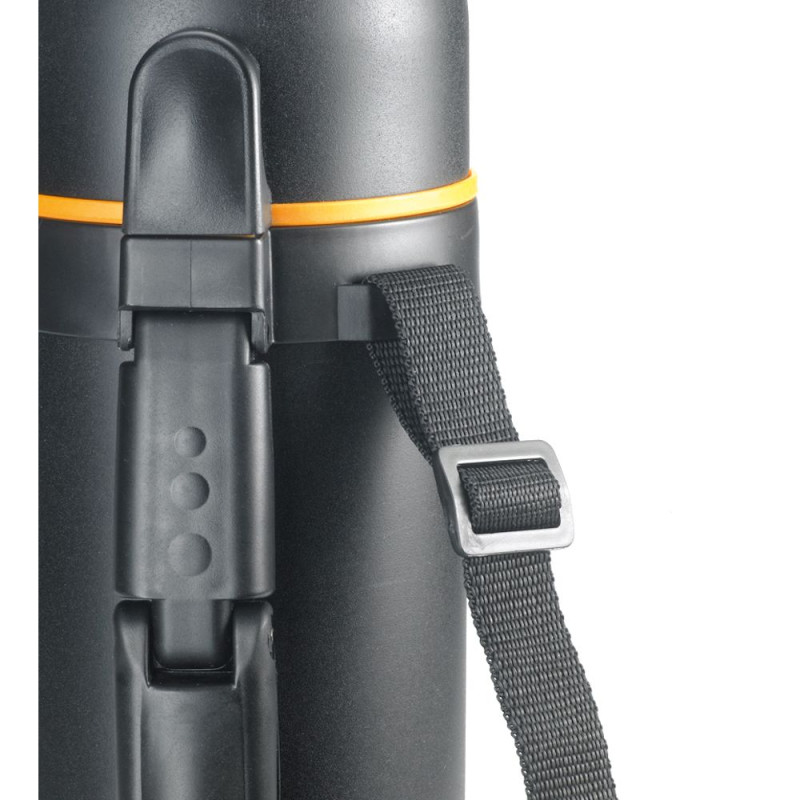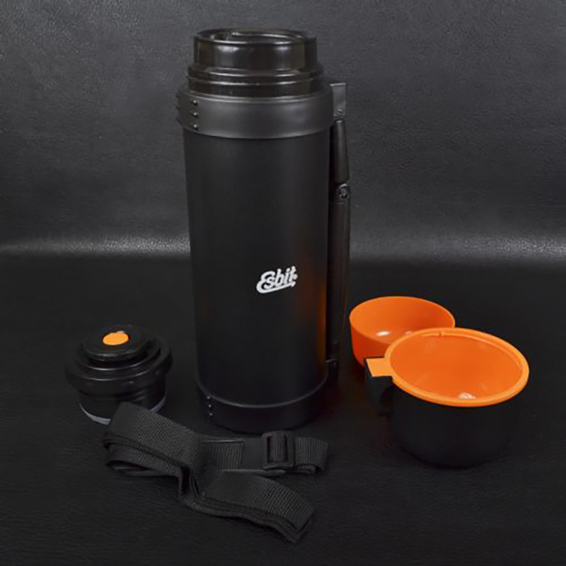 Термос с лямкой для транспортировки, удобной ручкой и двумя чашками подойдет для длительных путешествий или обеспечит любимым напитком большую компанию друзей. Отверстие для наливания открывается / закрывается нажатием кнопки.