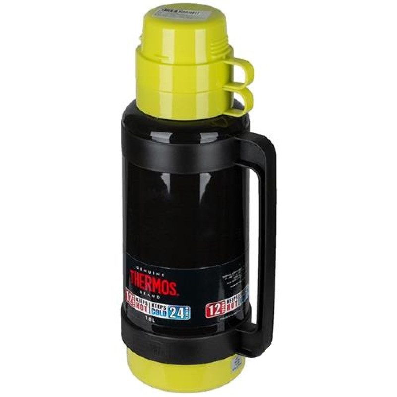Термос лайм Thermos 1.8 л разработан по специальной запатентованной технологии производства стеклянных колб Stronglas®, благодаря которой используемое в производстве модели стекло выдерживает термические удары, как от кипящих жидкостей, так и от жидкостей, охлаждённых до температуры порога замерзания. Пластиковый корпус состоит из амортизатора и уплотнительных колец из высококачественного силикона, которые предохраняют колбу от повреждений. Пробка термоса оснащена специальным клапаном, который в поднятом положении позволяет наливать напитки, а в закрытом – надежно предохраняет от выливания. Ручка обтянута резиной Santopren.