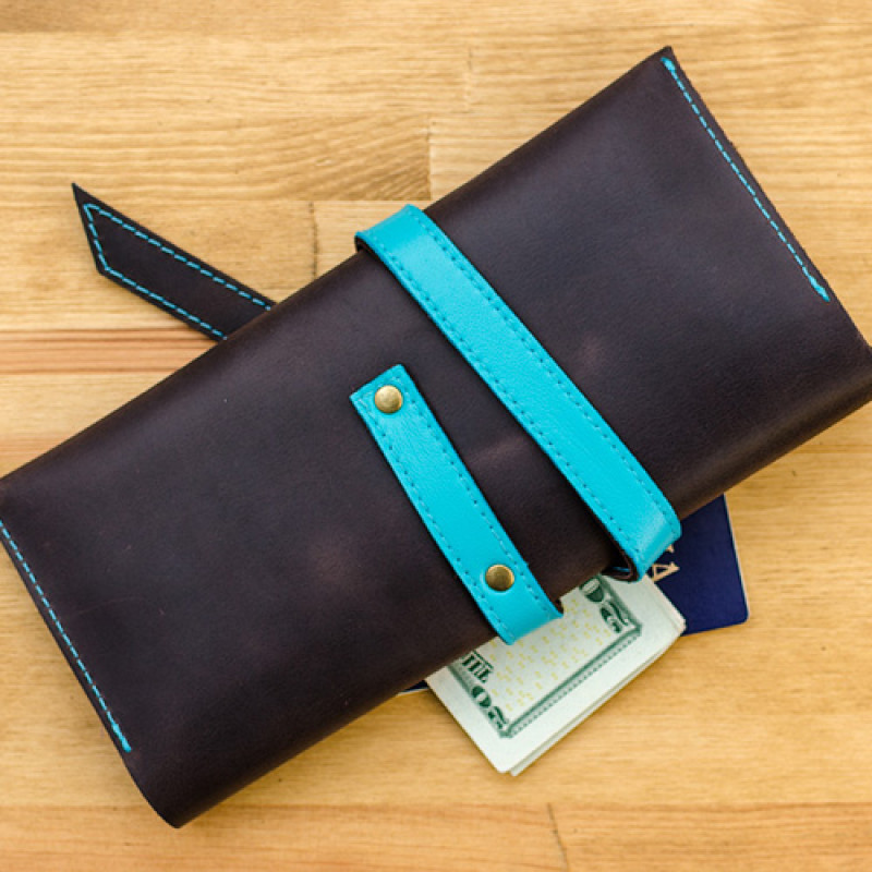 Это холдер для документов удобного размера, в котором поместятся посадочные талоны (или железнодорожные билеты), паспорта, деньги и масса других полезных вещей, которые должны быть всегда под рукой в путешествии. Холдер сделан полностью вручную из цельного куска очень плотной (2 мм) натуральной кожи. Закрывается он на кожаный хлястик, который крепится двумя люверсами, по совместительству формирующими держатель для канцелярских принадлежностей.